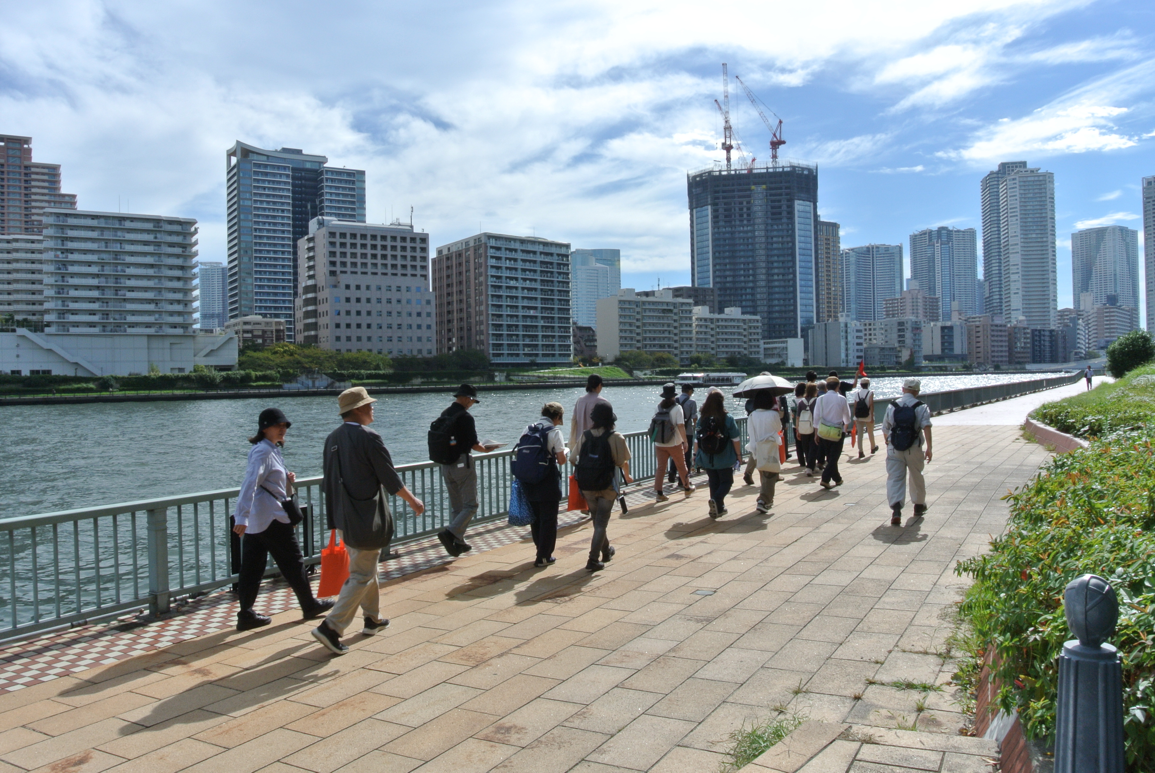 「川を歩こう(隅田川コース)」では、隅田川により親しんでいただくため、川沿いを歩きながら川の様子や歴史、川づくりなどについて解説します。 行事の前半では、水上バスに乗って、川からまちを眺めていただきます。日ごろ何気なく眺めている川をより身近に感じることができるイベントです。