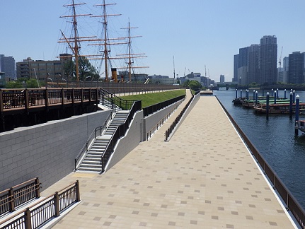 また、隅田川では親しみやすい水辺環境を早期に提供するため、先行してテラスを整備し、 地震に対する安全性を高めるとともに、散策路として開放しています。