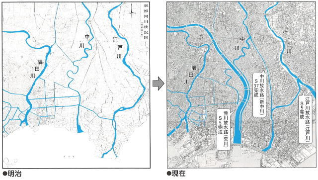 その後、明治40・43年の大洪水により荒川放水路が開削され、 昭和13年の洪水、高潮により中川放水路が開削されて、ほぼ現在の地形となっています。