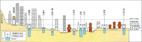 このうち、東部低地帯といわれる江東、墨田、江戸川、葛飾、荒川、大田区などの低地は、 沖積層と呼ばれる軟弱な土砂からなる地層が厚く堆積しており、荒川、隅田川などの大きな河川と そこから枝分かれした支川などが縦横に流れています。