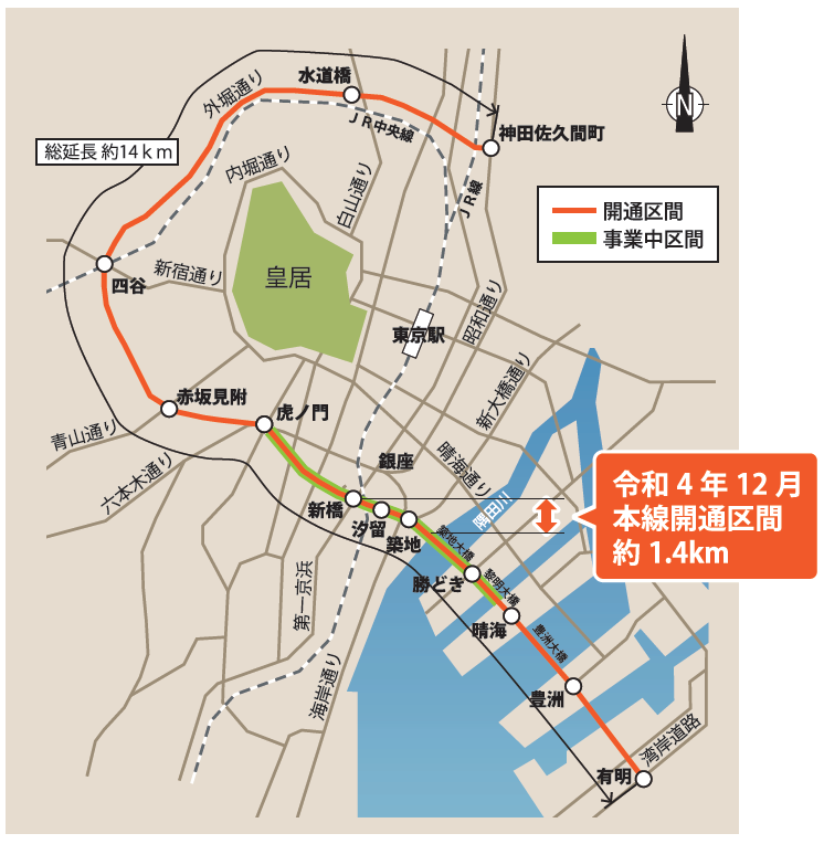 令和4年12月の中央区築地から港区新橋までの約1.4km区間の開通により、環状第2号線全線が開通しました。