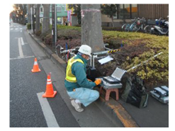 道路巡回点検では、立川工区に直営班、東村山工区に巡回委託点検班を配置し、道路施設の不具合箇所の早期発見、緊急措置を行っています。