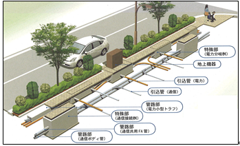 都市防災機能の強化、安全で快適な歩行空間の確保及び良好な都市景観の創出を目的として、既存の電線類を電線共同溝(CCBOX)へ収容する道路の無電柱化事業を実施しています。電線類を地中化することで視線を遮る電柱や電線をなくし、歩行者や車いす利用者も移動しやすい歩行空間を確保することに加え、災害時の電柱倒壊を防止するとともに電線類の被災の軽減に寄与します。