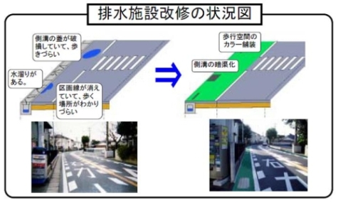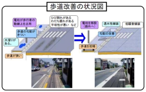 また、路面補修に併せて、現道内において歩道の設置・拡幅や、歩道勾配の改善や段差の解消、電柱の移設を行うほか、側溝の暗渠化といった排水施設改修と合わせて実施するなど、快適な歩行空間の確保及びバリアフリー化を視野に入れて歩道の改善を推進しています。