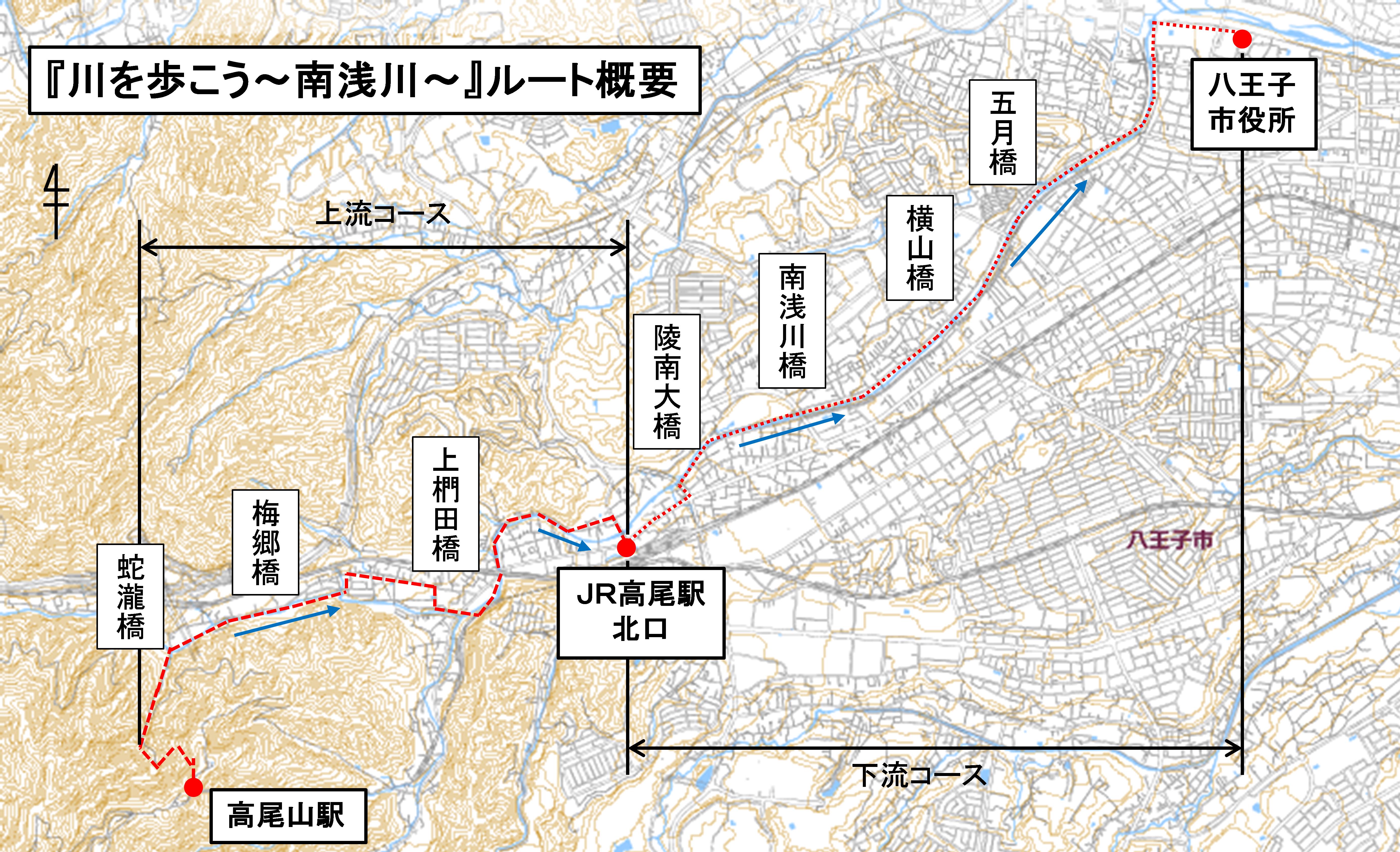 東京都では、東京の川への親しみや愛着を持っていただくため、河川愛護月間(毎年7月)に各種行事を行っています。当事務所では、「川を歩こう~南浅川~」を開催しています。川沿いを歩きながら、川の様子や歴史、川づくりなどについて、スタッフが解説し、日頃何気なく歩いている川をより身近に感じてもらう行事で、南浅川には、「ケーブルカー高尾山駅からJR高尾駅に至る上流コース」と「JR高尾駅から八王子市役所に至る下流コース」の2コースがあり、隔年で実施しています。