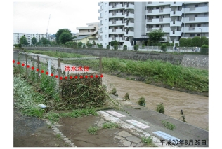 平成20年8月末の豪雨では、河川からの溢水により都内約4.59haが浸水被害を受けました。また、平成28年8月の台風第9号では、幸いにも河川からの溢水はありませんでしたが、河川の水位が護岸天端まで上昇しました。