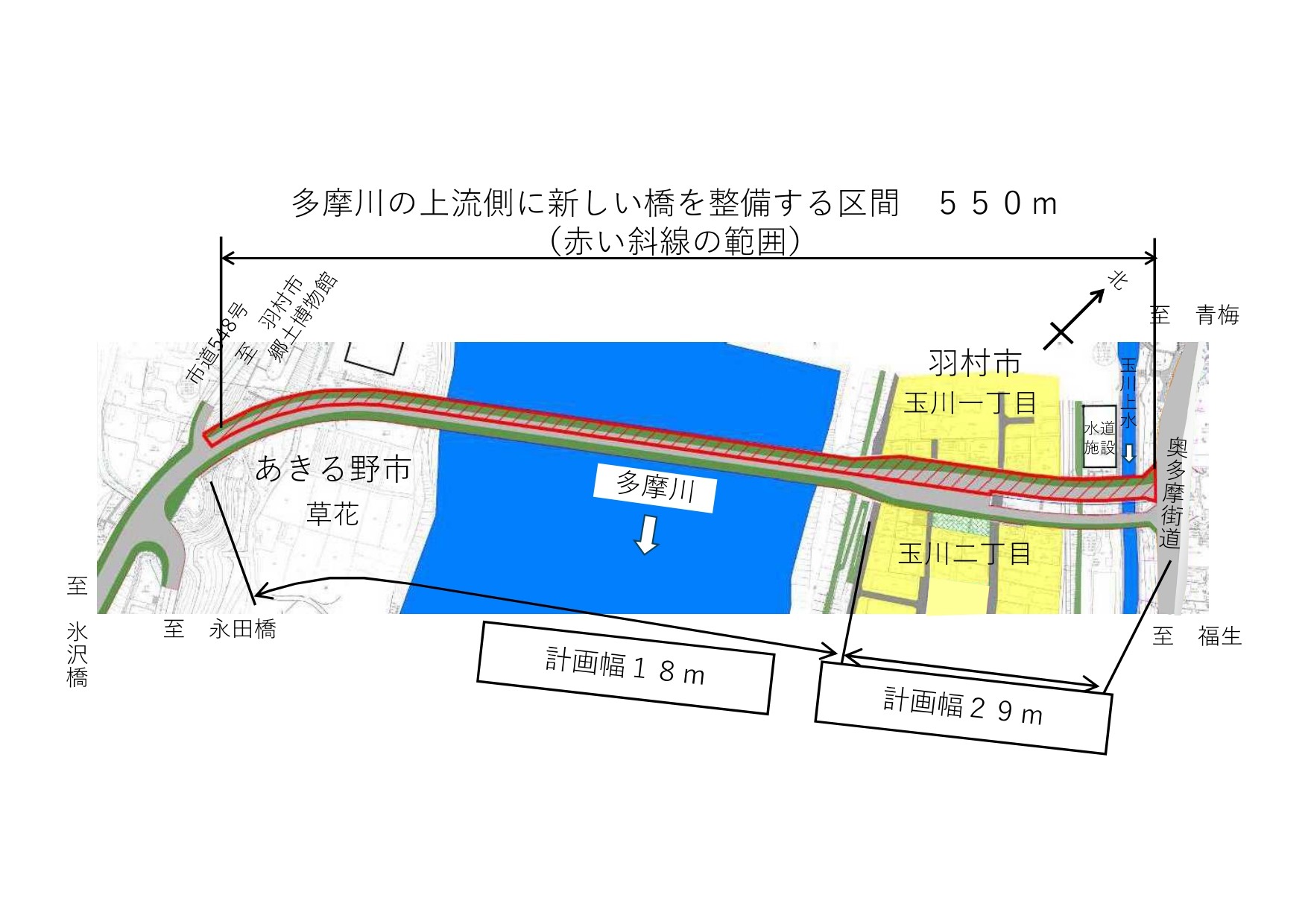 このため、東京都では、未整備の多摩川の上流側半分に新しい橋を整備し、現在の橋と併せて、「羽村大橋」として完成させる予定です。