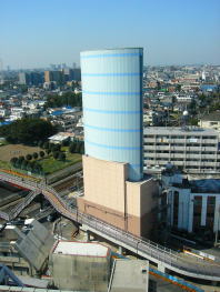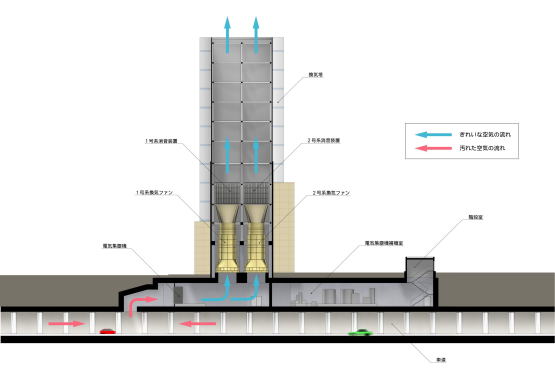 自動車の排気ガスを含むトンネル内の空気を設備内に引き込み、浮遊粒子状物質(SPM)を除去・低減した後に、地上45mの排気塔を介して、大気中に放出されます。