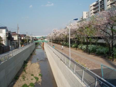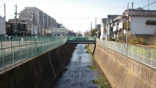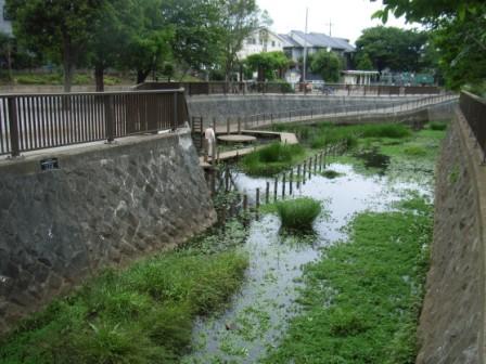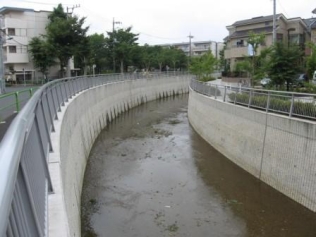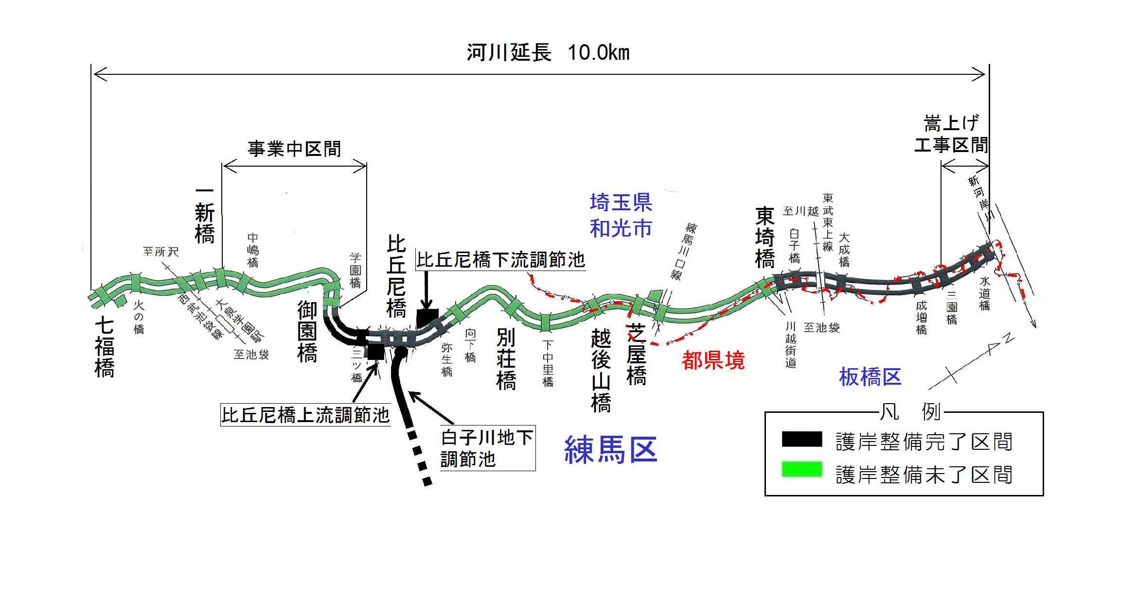 このうち、下流部の新河岸川合流点から川越街道までの区間については、これまでに50mm整備が完了しています。 また中上流部に位置する練馬区内の比丘尼橋付近には、洪水を一時的に貯留し水害を軽減する調節池が2ヶ所 (比丘尼橋上流・下流調節池)完成しており、現在は、これら調節池の上流側で護岸の整備を進めています。