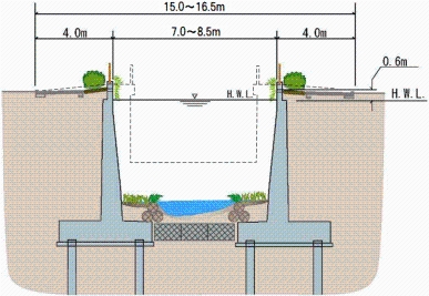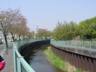 白子川では、白子川河川整備計画に基づき、1時間あたり50mmの降雨により生ずる洪水を安全に流すため護岸や調節池の整備を行っています。 また、護岸整備に当っては、川底に土を残して自然な河床とし、生物の生息・育成環境に配慮するとともに、 河川沿いの用地を幅広く確保できた区間では、地域の方々の意見を踏まえながら、 人や生物にもやさしい緩傾斜護岸を整備し、良好な河川環境の創出に努めています。
