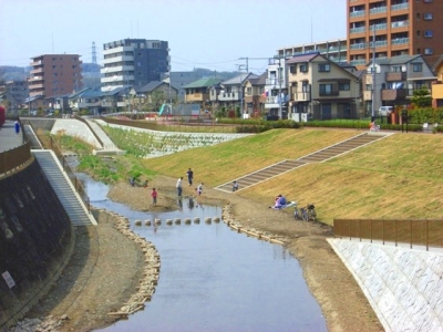 整備にあたっては、治水面の安全性の向上とあわせて、管理用通路を緑豊かな遊歩道として整備し、川沿いにスペースがある箇所では、緩やかな傾斜の護岸を整備するなど、人々が水辺に近づける工夫をするとともに、動植物の生息・生育環境などにも配慮した川づくりに努めています。