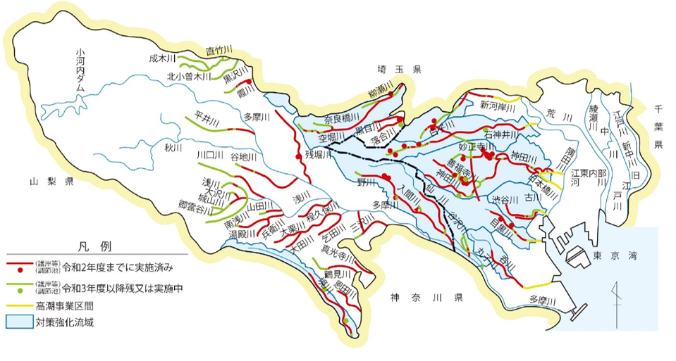 東京都では、河川や下水道の整備、貯留浸透施設の設置等の取組を定め、総合的な治水対策を推進するため、平成19年8月に「東京都豪雨対策基本方針」を公表し、平成26年6月に「東京都豪雨対策基本方針(改定)」が策定されました。