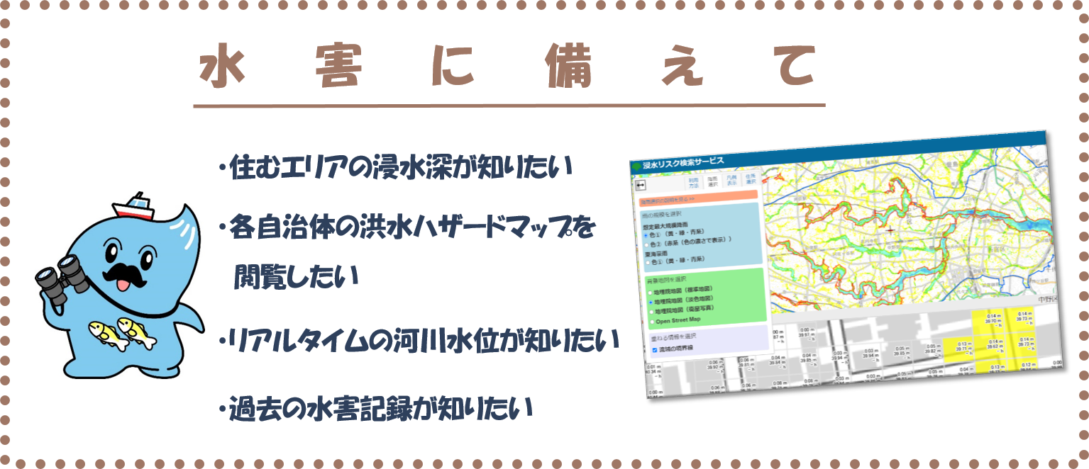 東京都で実施している洪水対策をわかりやすく解説したパンフレットです。大雨への準備がどのように行われているのか、どのようなことに気を付けたらいいのかなど、子どもから大人まで学べる一冊です。