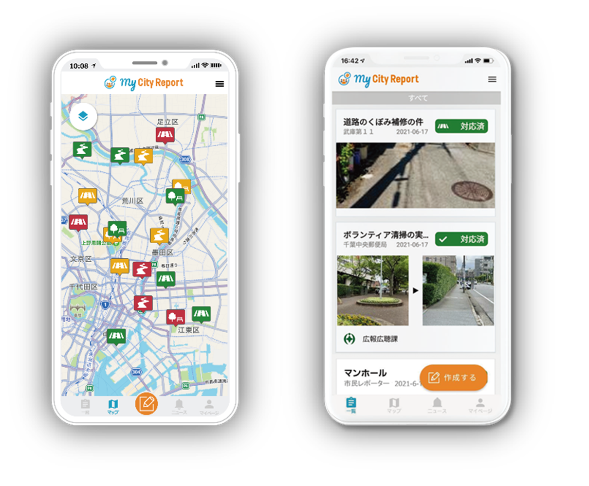 - My City Reportは、スマートフォンのカメラと位置情報を活用して、都民の皆様が、道路や公園、河川施設等のインフラの損傷や不具合を、気付いたその場で投稿できるスマートフォンアプリです。