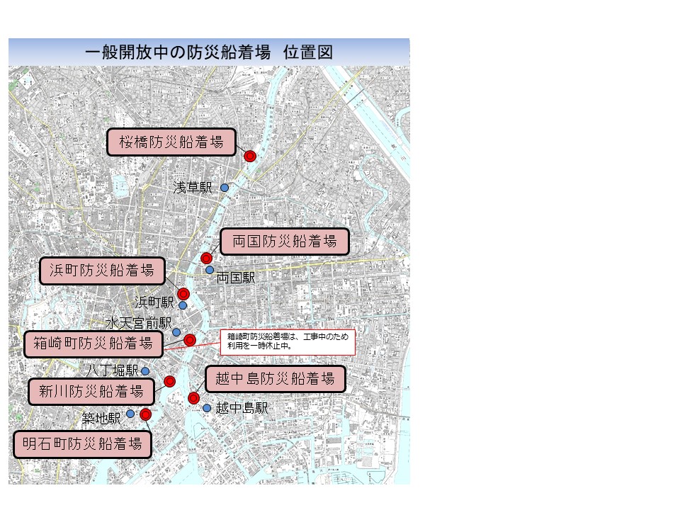 隅田川では、水上バスや屋形船など船による観光が盛んになっているため、東京都は、越中島防災船着場(江東区)、明石町防災船着場(中央区)、桜橋防災船着場(台東区)、両国防災船着場(墨田区)、浜町防災船着場(中央区)、箱崎町防災船着場(中央区)及び新川防災船着場(中央区)を一般の船舶に開放しています。なお、舟運事業者による船着場の習熟利用を促進するため、ネット予約による防災船着場の利用料金について、通常料金から半額割引を実施しています(令和8年3月31日まで)。今後も、水上遊覧ツアーなどで東京の水辺をお楽しみください。なお、箱崎町防災船着場は、工事中のため一般開放を一時休止しています。