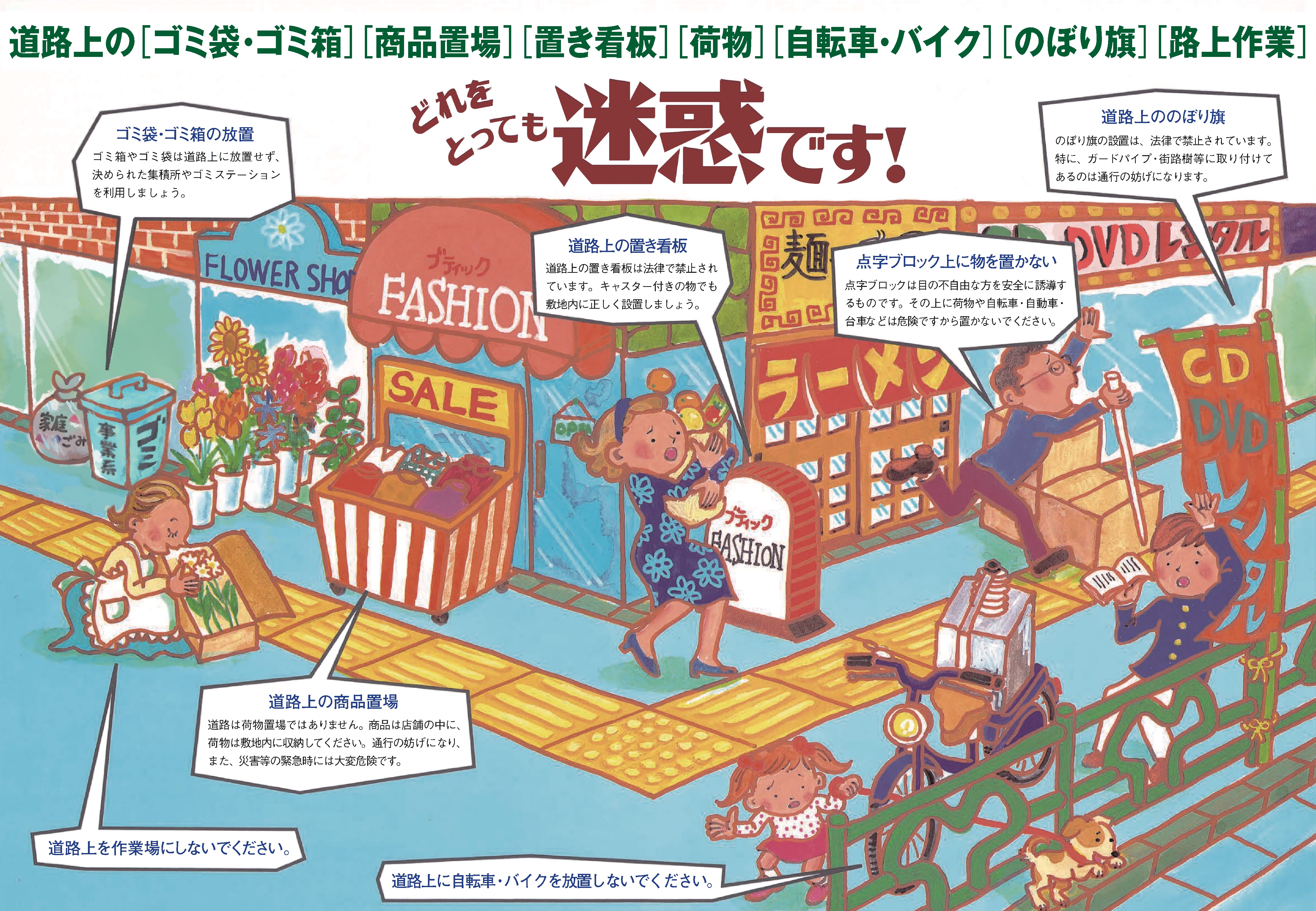 道路上に「置き看板」「のぼり旗」「商品置場」等を放置することは、通行の支障になるばかりでなく、事故を招きかねないため、道路法で禁止されています。特に、点字ブロックの上に荷物などが放置されていると大変危険です。