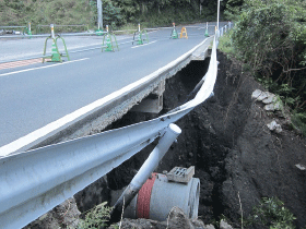 豪雨・地震・噴火災害など異常な天然現象に伴う災害で被害を受けた道路施設を「公共土木施設災害復旧事業費国庫負担法」に基づいて復旧する事業です。
